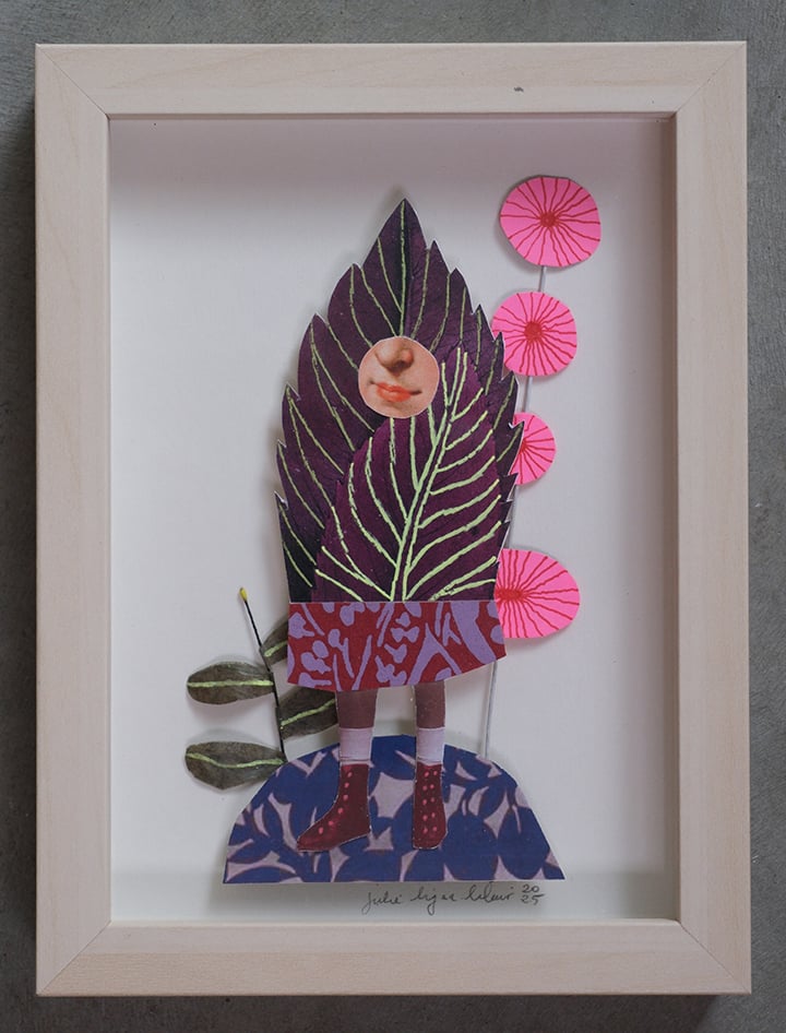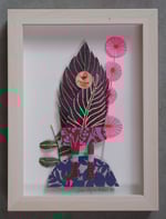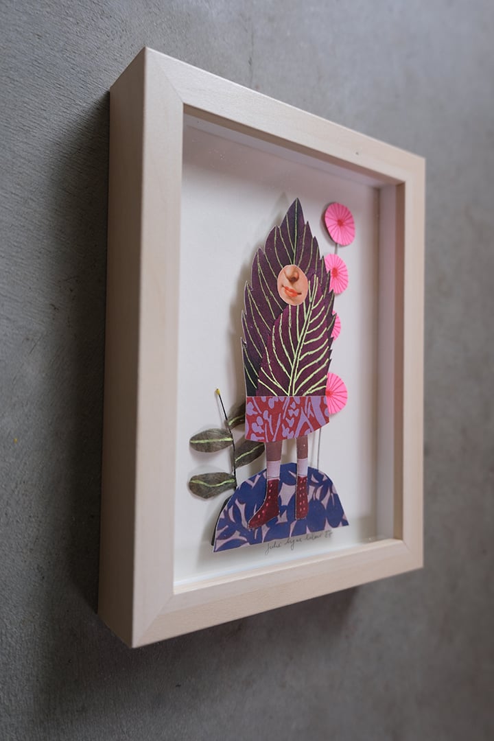 this is a 3D collage in a birch finish shadow box frame with plexiglass.